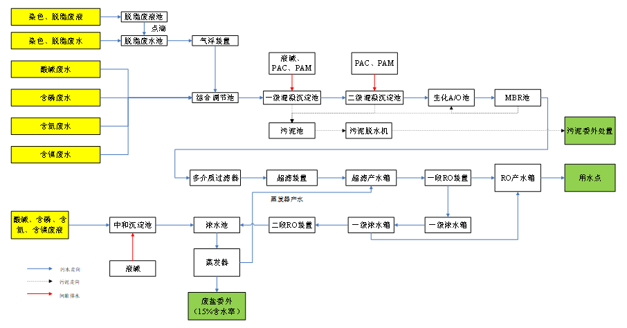 考虑到废液中污染物浓度很高,对于后端膜系统的处理是非常不利的,因此采用“清浊分流”的思路,高浓度的废液经过收集后单独处理,低浓度的废水经预处理后去除大部分对膜系统有影响的污染物,然后进入膜系统浓缩,浓缩后与废液一起进入蒸发器蒸发。