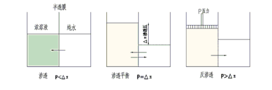 反渗透亦称逆渗透(RO),是用一定的压力使溶液中的溶剂通过反渗透膜(或称半透膜)分离出来。因为它和自然渗透的方向相反,故称反渗透。根据各种物料的不同渗透压,就可以使大于渗透压的反渗透法达到分离、提取、纯化和浓缩的目的。