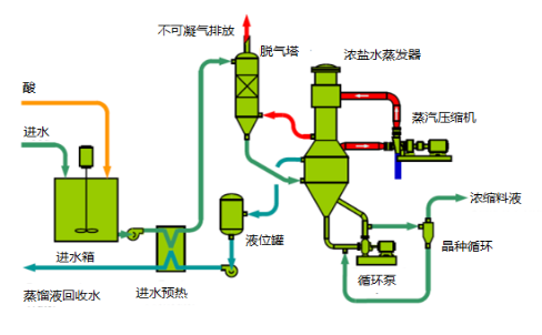 机械蒸汽再压缩降膜蒸发工艺可参见下方蒸发器系统的简图。