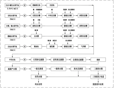 含铬废水、重金属废水、酸碱废水、含油废水、生活污水经预处理后进入中间水池进行水质、水量调节。再经石英砂、活性炭、自清洗过滤器、超滤四重物理过滤,去除废水中悬浮物、胶体、病毒等,出水水质SDI小于5,满足反渗透进水水质要求。再经反渗透、浓水反渗透两级过滤去除水中的无机盐,产水直接回用,少量浓水进三效蒸发蒸发浓缩,蒸馏液回用,少量固体废水外运处理。