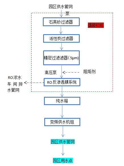 处理工艺流程:园区供水管网—石英砂过滤器—活性炭过滤器—精密过滤滤器—RO反渗透膜系统—纯水箱—变频供水机组—供水管网—用水点