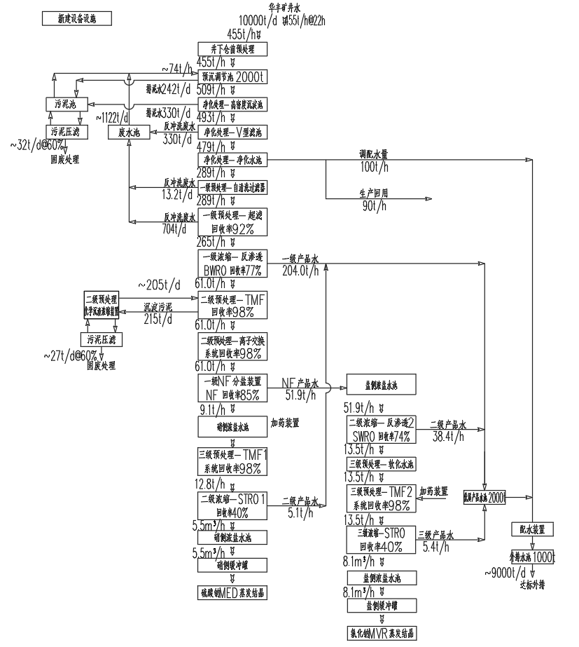预沉调节池→高密度沉淀池→V型滤池→净化水池→一级预处理-自清洗过滤器→一级预处理-超滤→一级浓缩-反渗透→二级预处理-TMF→二级预处理-离子交换→一级纳滤分盐→硝侧浓盐水→三级预处理-TMF→二级浓缩-反渗透→硫酸钠MED分盐装置;盐侧浓盐水→二级浓缩-反渗透→三级预处理-TMF→三级浓缩-反渗透→氯化钠钠MVR蒸发盐装置