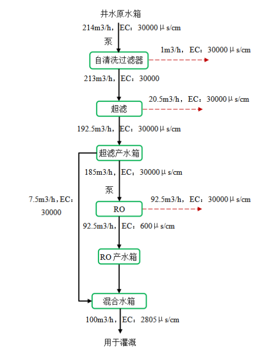 地下水采出后储存于原水箱,首先由超滤进水泵经自清洗过滤器去除微量大粒径悬浮物后进入超滤装置,经超滤装置预处理后进入超滤产水箱;再由反渗透进水泵送入反渗透装置进行脱盐处理,脱盐后与少量超滤产水在混合水箱混合,控制电导率不超过3000μs/cm,混合水箱出水即可用于灌溉。